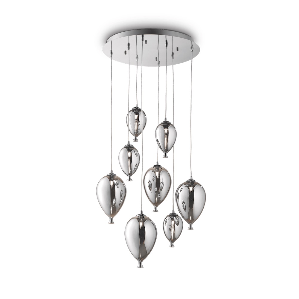 Kreatívny sklenený luster CLOWN SP8 v dizajne 8 balónikov v chrómovej farbe je originálny luster s 8 svietidlami so sklenenými tienidlami rôznych tvarov a veľkostí v chrómovej farbe. Luster s jedinečným a prepracovaným dizajnom v tvare balónikov sa hodí do akejkoľek miestnosti Vášho interiéru. Tienidlá z chrómových dymových skiel v tvare balónikov.