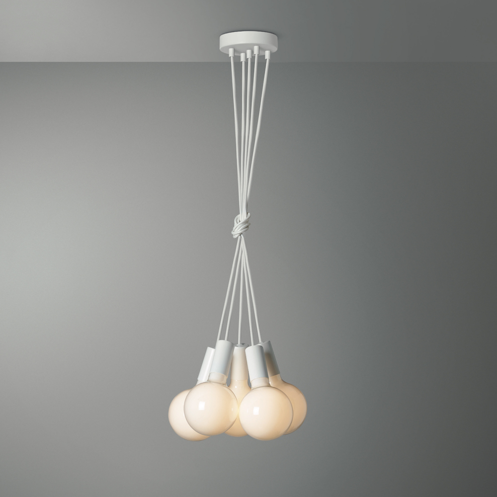 Závesné svietidlo VENEZIA je svetelné riešenie pozastavajúce z 5 pätíc v bielej farbe. Vhodné pre spálne, kuchyne a iné miestností, ktoré je potrebné osvetliť a oživiť. Toto riešenie osvetľuje priestor diskrétnosťou a jednoduchosťou pri skromných nákladoch. Môžete si vybrať medzi teplejším svetlom s vysokou kvalitou svetla alebo jasnejším svetlom. V obidvoch prípadoch je možné meniť intenzitu svetla pomocou stmievačov (je potrebné disponovať zabudovaným stmievačom alebo ho dokúpiť). 5 Závesných svietidliel vychádzajúcich z veľkej stropnej rozety s 5 rovnakými žiarovkami. Obzvlášť vhodné pre veľké prostredia, ako sú haly, salóniky, spálne. Môžete si vybrať rôzne modely z elegantne navrhnutých žiaroviek s mimoriadnym vizuálnym komfortom. Tieto kombinácie sa vyznačujú žiarovkami s povrchovou úpravou podobnou porcelánu, ktoré dávajú štruktúre veľmi rafinovaný vzhľad a majú rozptýlený, rovnomerný, veľmi relaxačný a zároveň intenzívny svetelný efekt. Žiarovky s povrchovou úpravou podobnou krištáľu majú žiarivejšie, živšie a ostrejšie svetlo. Obidve riešenia ponúkajú vysoké farebné podanie a možnosť zmeny intenzity svetla ( v prípade že máte zabudovaný vlastný stmievač alebo si dokúpite stmievač z nášho sortimentu).